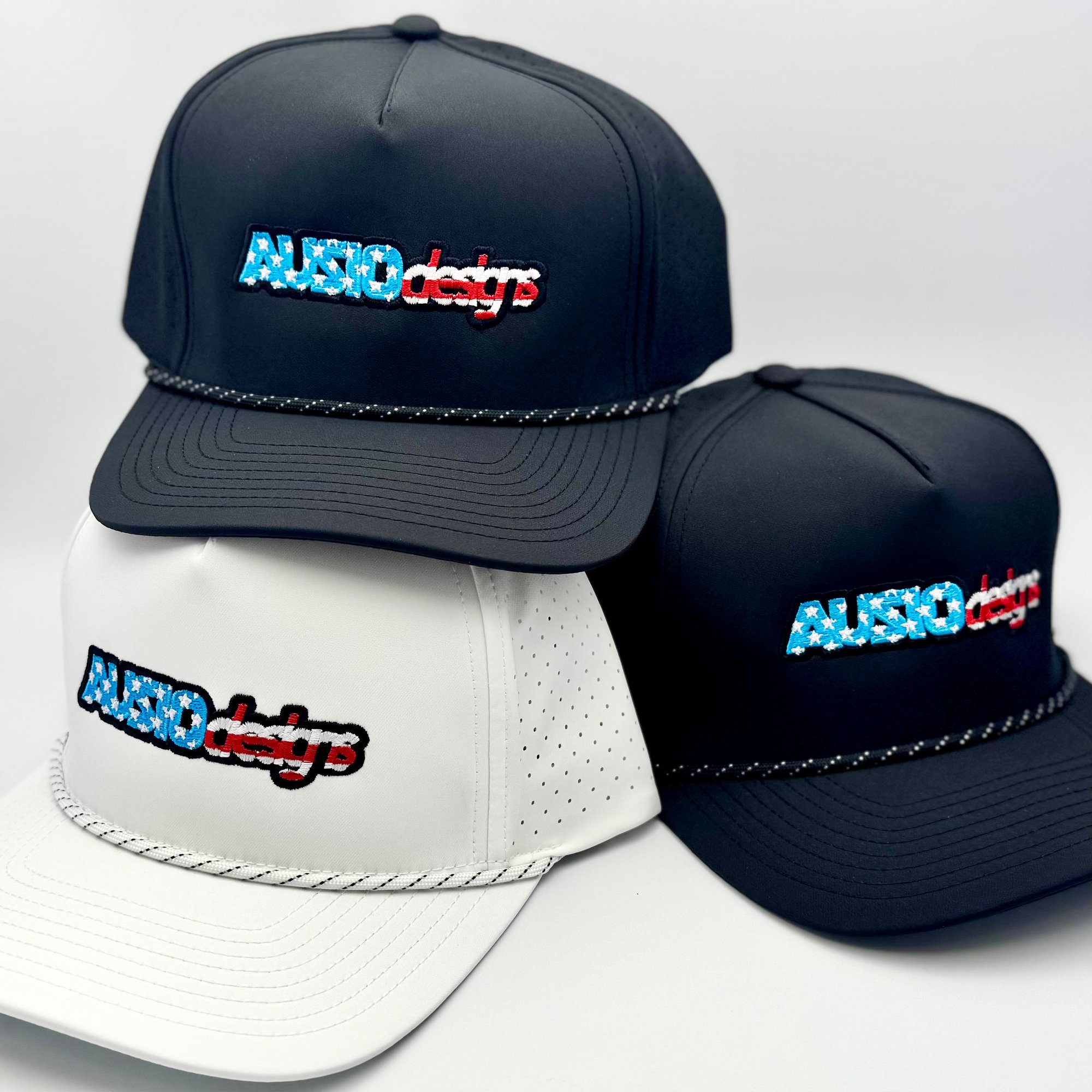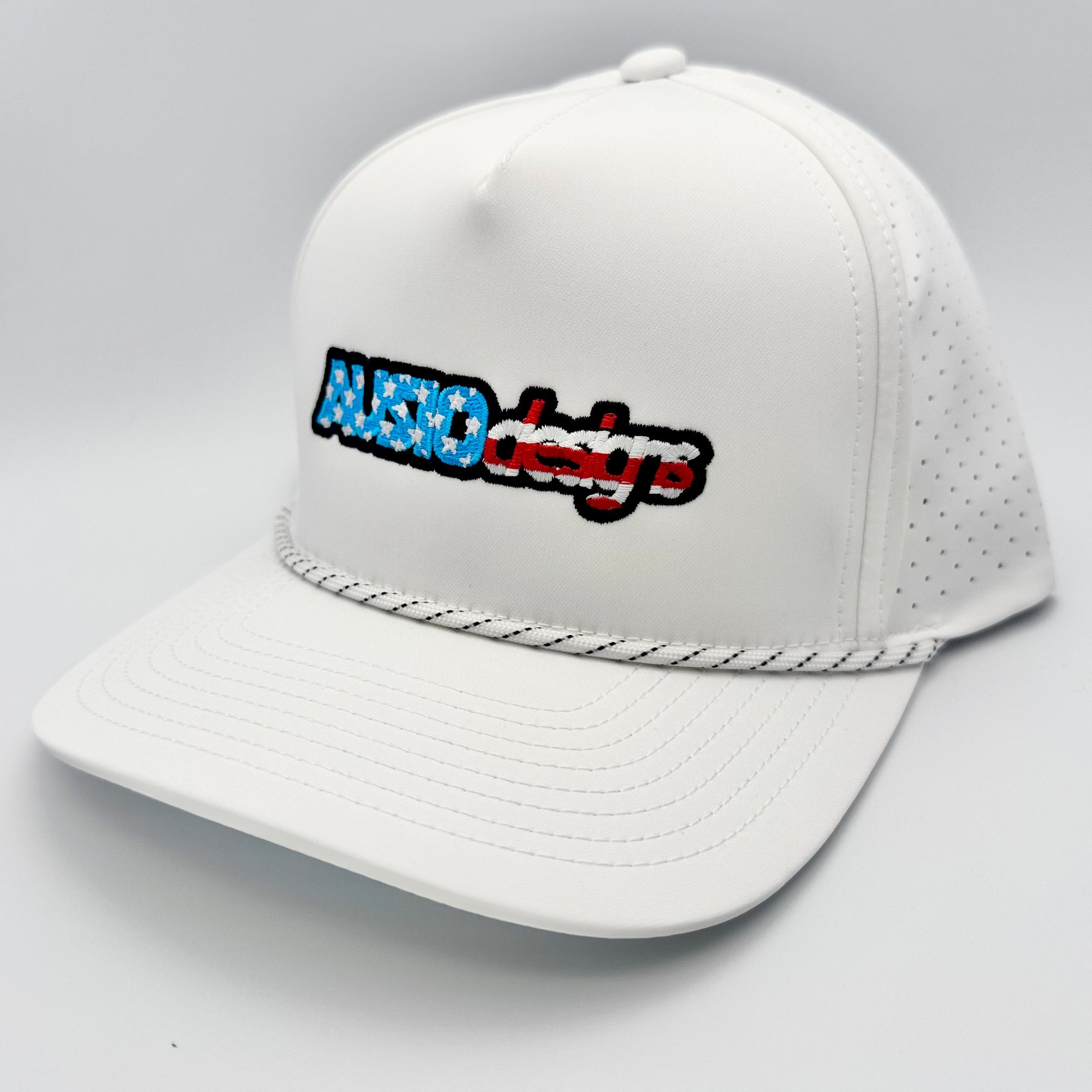 AUS10designs Stars and Stripes stitched on a rope style golf hat.